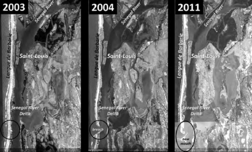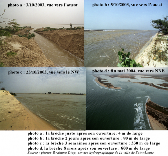 Sous l’effet combiné de l’océan et du fleuve Sénégal, dont le flux a soudain trouvé une sortie directe et brutale vers la mer, cette brèche s’est rapidement élargie. L’effet « entonnoir » a accéléré les courants, intensifiant l’érosion et provoquant un agrandissement incontrôlé de l’ouverture.