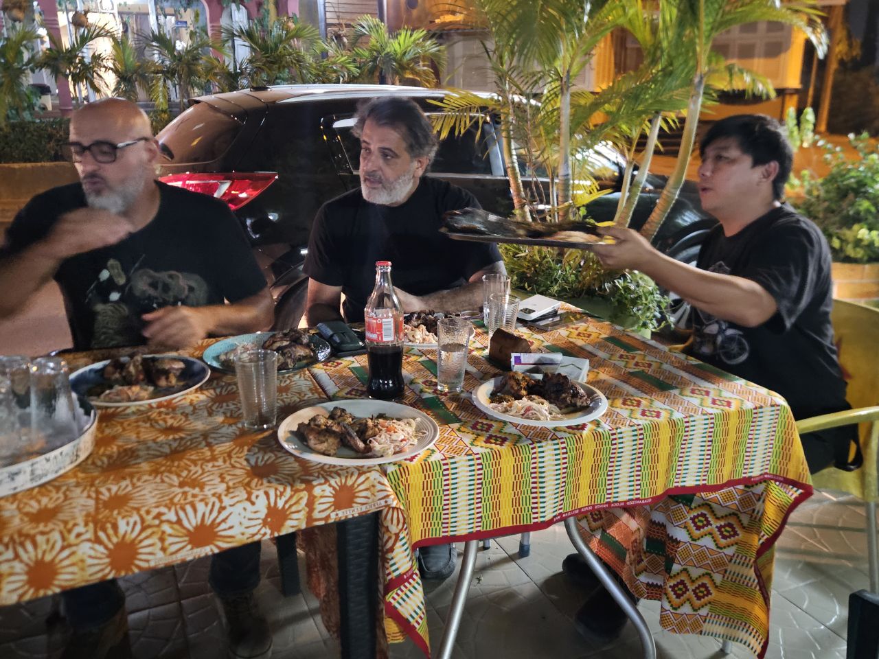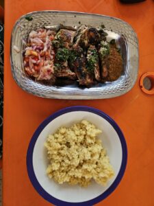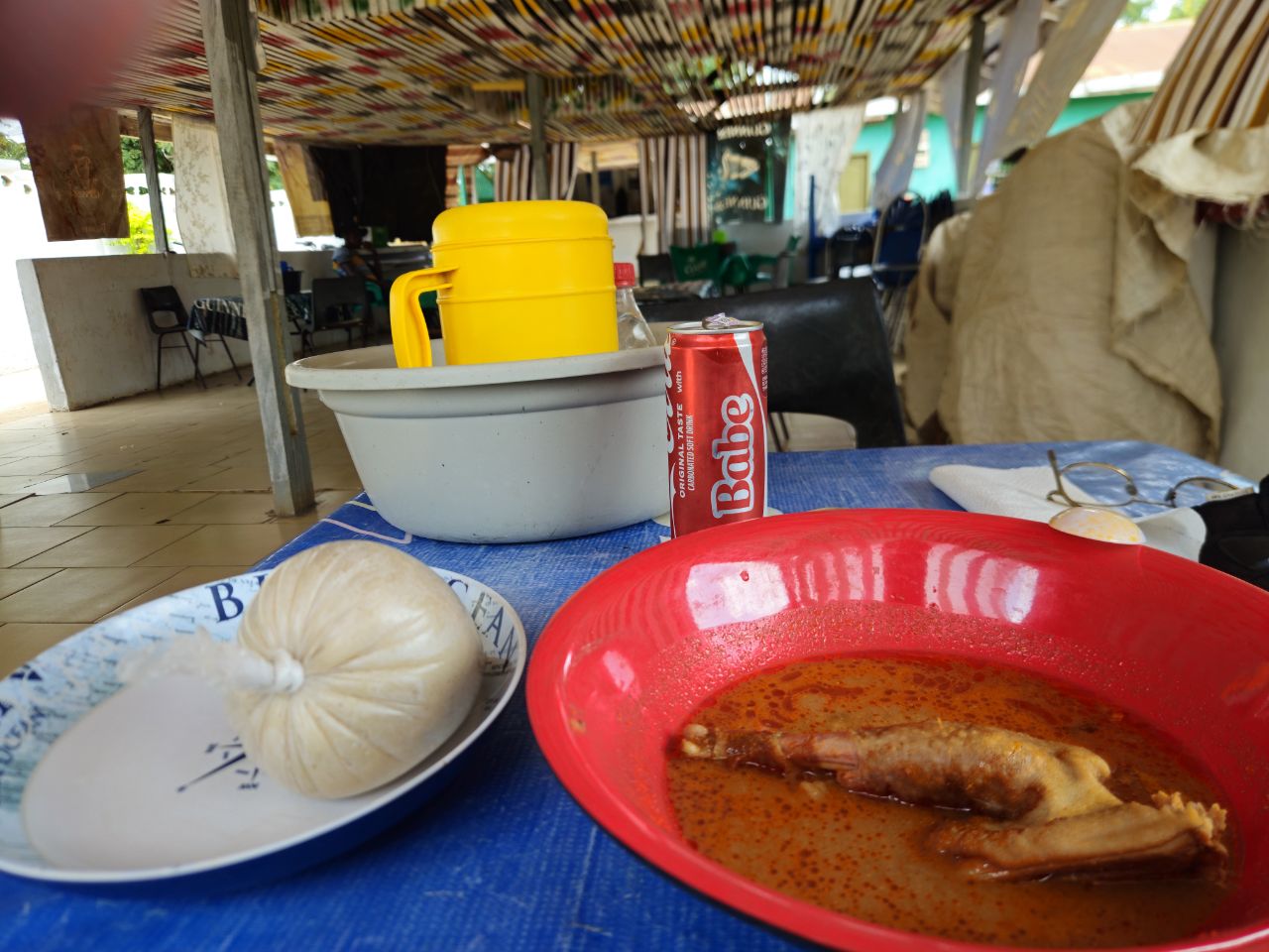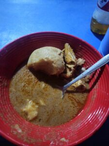 The food is also quite different. No grilled chicken with attiéké here, but rather meat in sauce — always the same one, it seems, whatever the meat (or fish) — served with banku, a mix of fermented maize and cassava, presented as a smooth, dense white paste, cooked in boiling water.