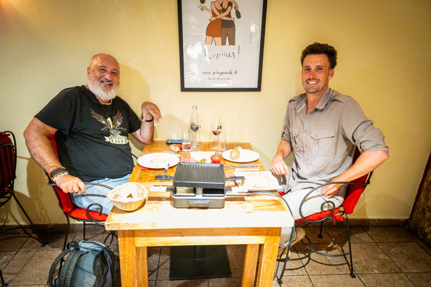 In the evening, raclette at “La Route des Vins.” I met Franck, the founder of the place. He tells me he just sold it. His wife, Rolande, who is Beninese, has already returned to Benin where they plan to open a new bar-restaurant, also called “En Route.” Opening soon. I’ll definitely go see them.