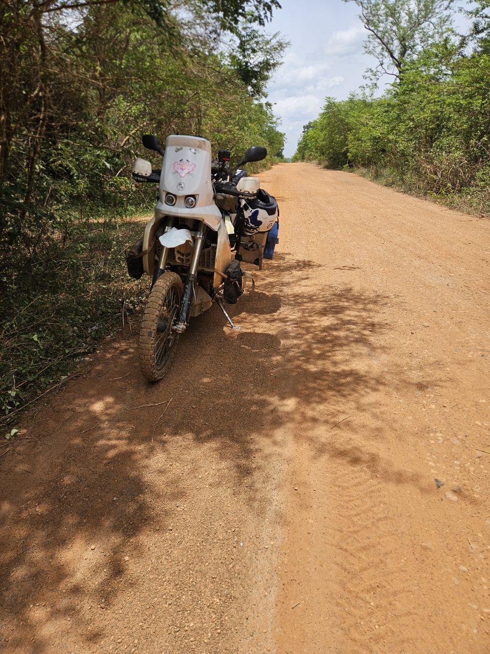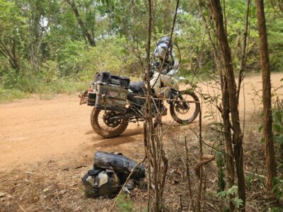 Anyway, everything is going well… until suddenly, as I finish a short laterite descent — the only one of the day — the steering becomes stiff. I stop and realize, in disbelief: my front tire is flat! Again! Even though I had just installed a new tube.