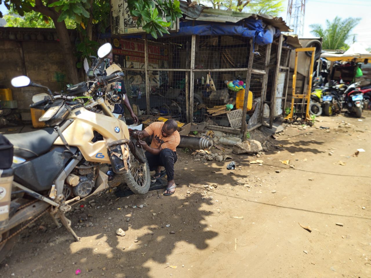 Travel has taught me one thing: trust your lucky star, fate. That flat tire led me to discover the fork issue — when I had decided, almost against my instinct, to rush toward Togo. That breakdown brought me to Rachid. He fixed it without hesitation.