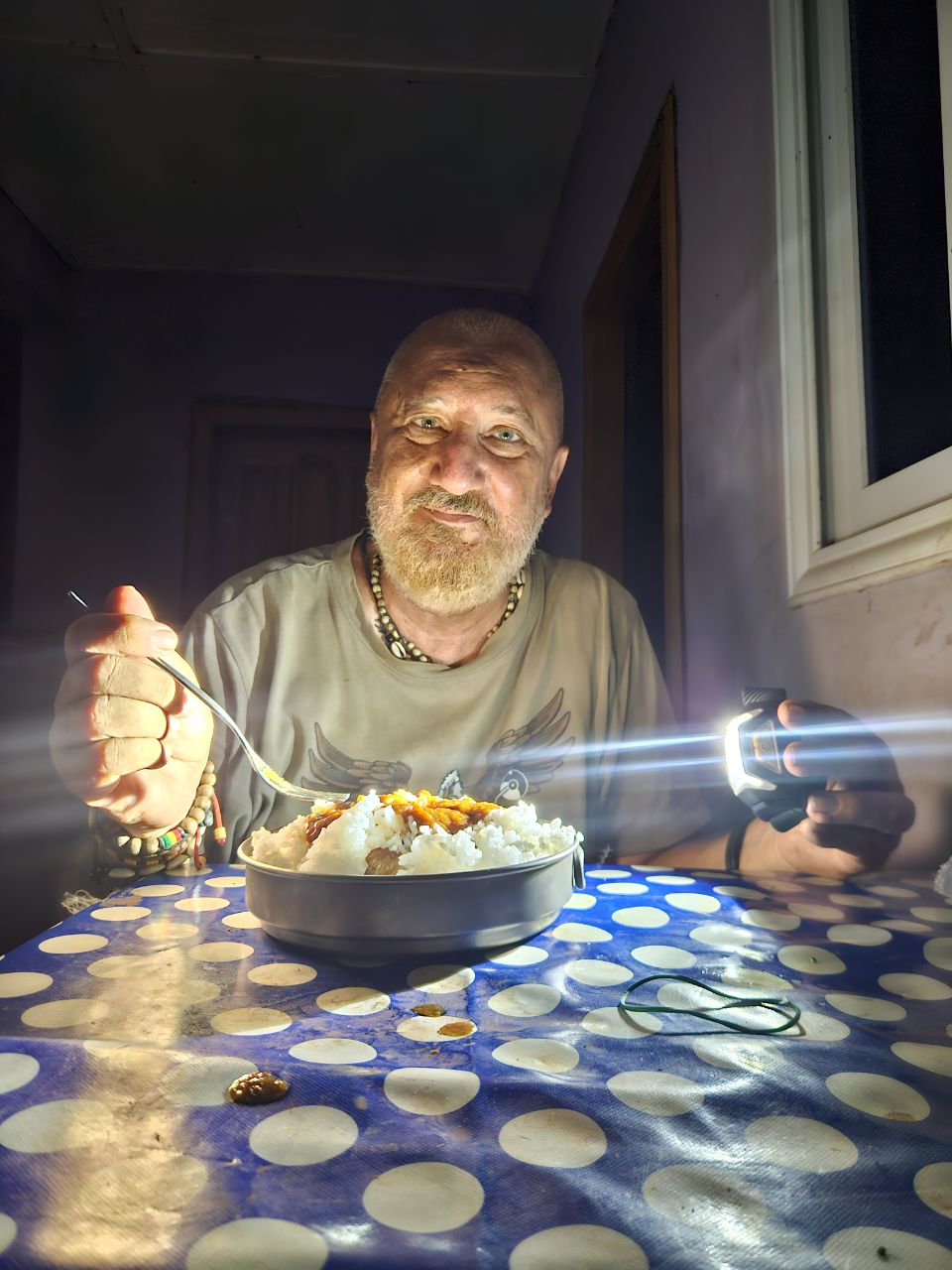 He asks me to sit and tells me he’ll eat first.