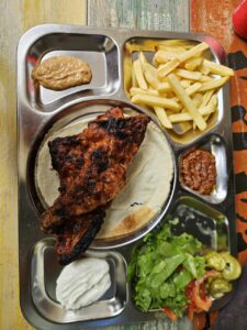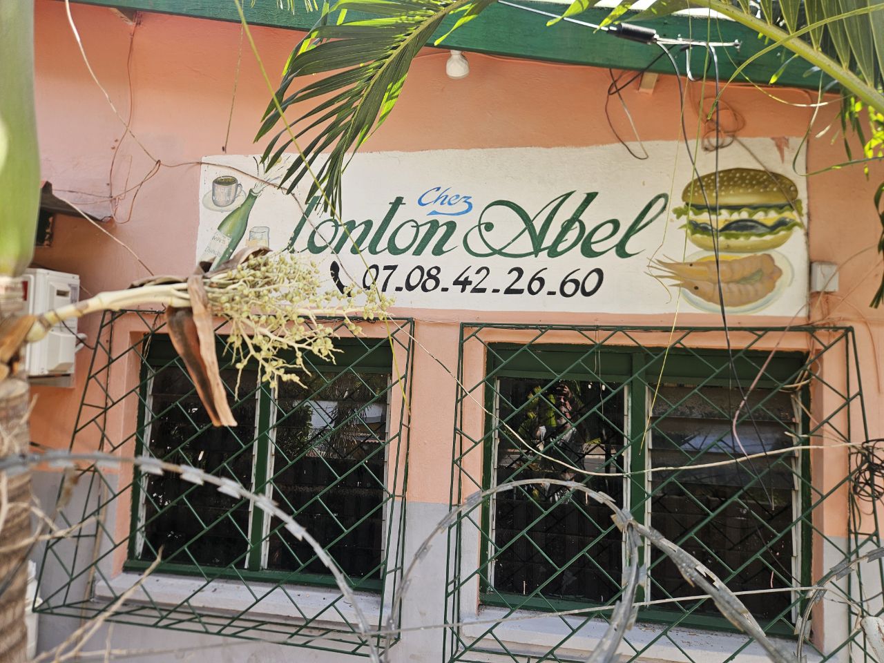 At lunch, I choose chicken (there’s also goat, agouti, mutton, fish…). I get a drumstick from a real “bicycle chicken” from the old days (25 years ago): it ran so much there’s almost no meat on it.