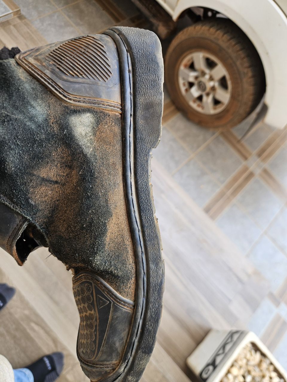 The ground was muddy and slippery — a water truck had just sprayed it to reduce dust. The car ahead stopped. So did I. My foot slipped… and down I went.