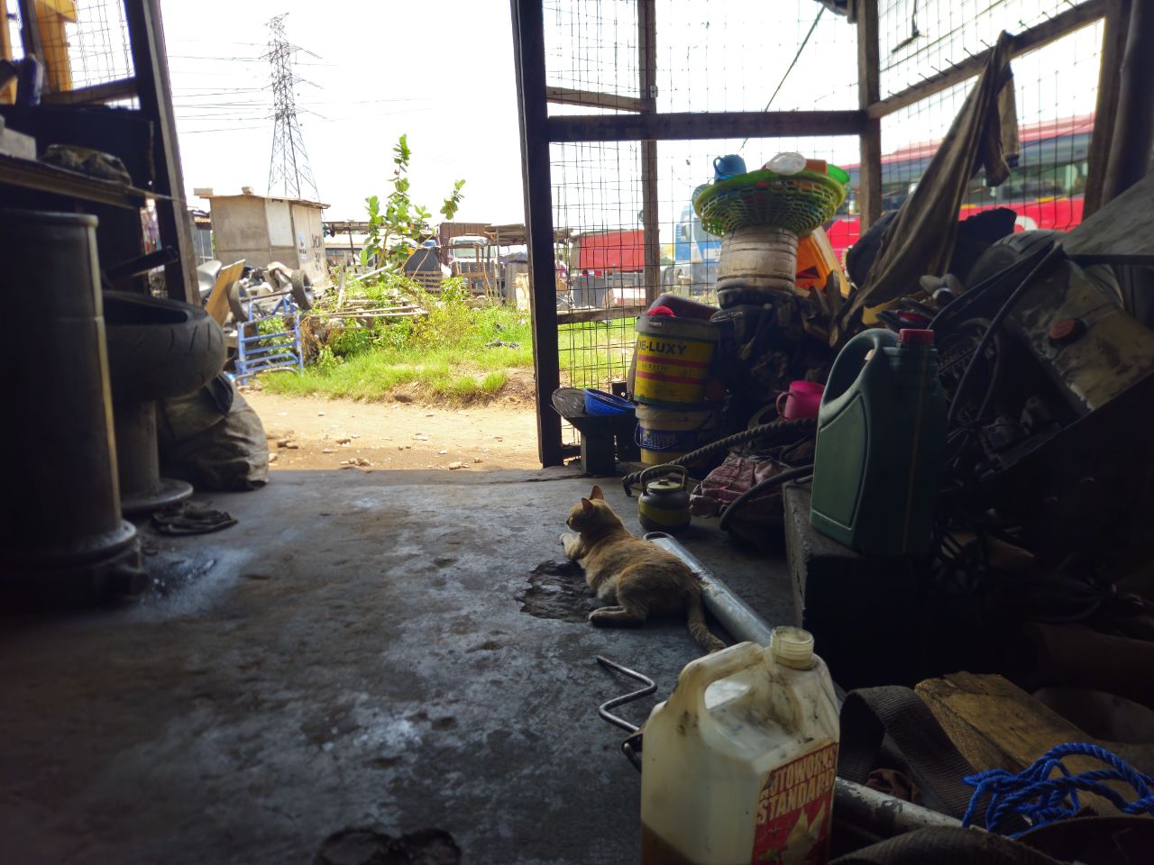 I arrive around 10:30. He’s not there yet. His assistant is sitting on a stone. The area… looks like an area. And the shop looks more like a wire-mesh chicken coop than a workshop. Three ginger cats are waiting.