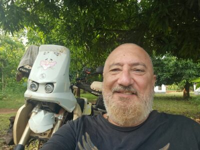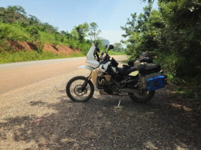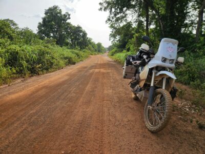 As for gear: I’m almost ready. I have a small case of equipment and a set of tires waiting for me in Cotonou. To get there, the rear tire will easily make the trip; the front one is a bit worn, but it should hold up.