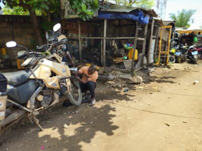 I find one 100 meters away. But he mainly works on trucks and doesn’t have the tools to remove my wheel. He points me to another shop across the street: they can remove it, and he’ll repair it afterward.