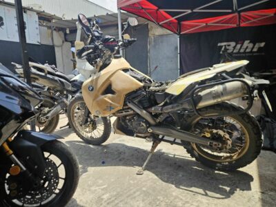 First difficulty: I can’t do it alone. I had this stand installed for situations like this, but it’s designed for the bike in its original configuration — about 5 cm higher (I lowered it so I can put my feet on the ground while traveling). That has an advantage: once on the stand, the bike sits very high. But also a downside: it’s very hard for me to get it onto the stand alone.