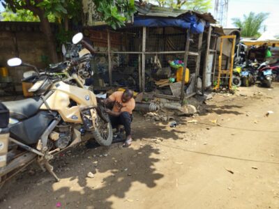 But surprise: it looks like someone siphoned part of my secondary tank. Last night I filled both tanks. The main one — under the seat — is locked, but not the secondary one, which actually has the larger capacity. I ride to a gas station to refill and check the missing amount: 3 liters. That’s the equivalent of a local bike’s tank. Someone got a free refill. It had never happened to me before… or maybe I just hadn’t noticed.